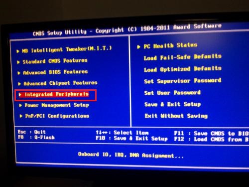 2、用上下箭頭把光標移動到Integrated Peripherals,然后回車