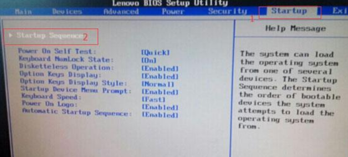 3、移動“→”方向鍵到Startup,如圖中選擇Startup Sequence,按enter;