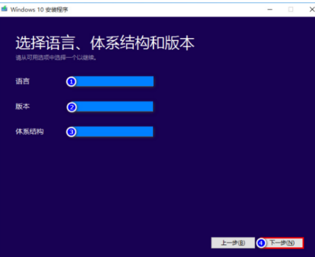 4.選擇當(dāng)前系統(tǒng)相同的語言,版本以及體系結(jié)構(gòu),完成之后點(diǎn)擊下一步即可。