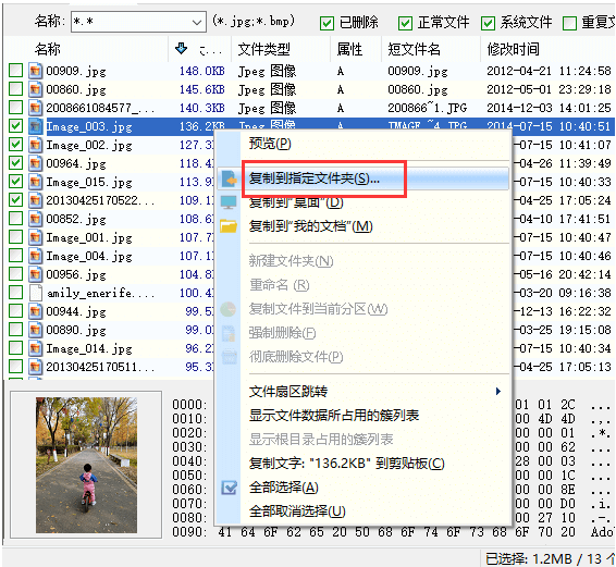 4、接著我們將丟失的文件復(fù)制到其他盤,完成U盤格式化恢復(fù)。勾選我們需要恢復(fù)的文件,鼠標右鍵點擊,選擇"復(fù)制到指定文件夾"。