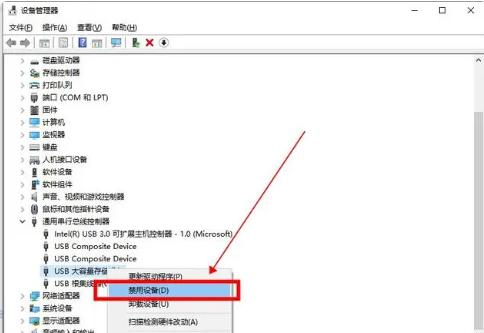 打開設(shè)備管理器,禁用“USB大容量存儲設(shè)備”。