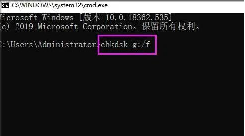 2、輸入命令【chkdskg:/f】,g"代表U盤的盤符,":/"在英文狀態(tài)下輸入。最后按下回車鍵,修復(fù)成功。