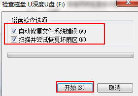 3.接著在彈出的檢查磁盤窗口界面中,將兩項全部勾選,鼠標(biāo)點擊“開始”進行掃描即可成功修復(fù)u盤文件刪不掉的情況。