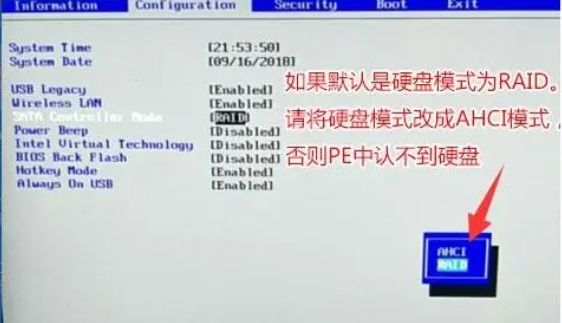 5.以后再返回【configuration】作用,大家查看【satacontroller作用上,假如默認的電腦硬盤模式是RAID,就必須把電腦硬盤模式改為AHCI模式,不讓大家進PE后無法識別電腦硬盤,就按F10來保存。
