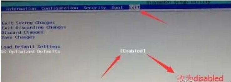 2.進行后大家將頁面遷移到【Exit】選項之中,把【OSOptimized將Defaults設置為“Disabled”,進而適用別的操作系統(tǒng)和U盤正確引導操作。