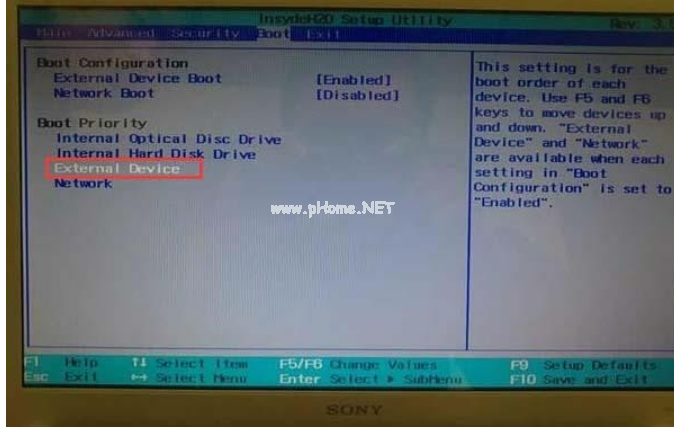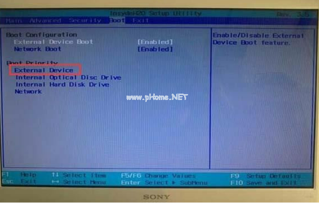 2、然后依然在boot選項卡中,按方向鍵“↑、↓”選擇External Device。