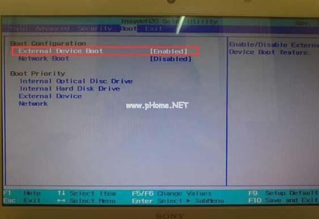 1、將制作好的u盤啟動盤插入電腦usb接口后,重啟電腦按f2進(jìn)入到bios界面,然后切換至boot選項卡,選中External Device Boot并按回車,將其改為Enabled。