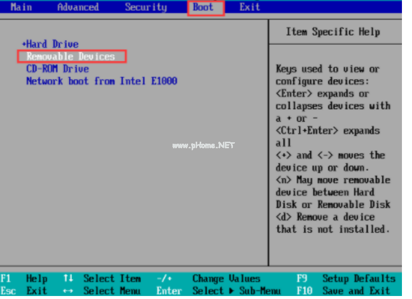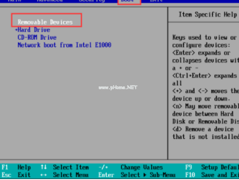 3、進(jìn)入BIOS設(shè)置后,我們使用右方向鍵移動到“Boot”,接著使用上下方向鍵將光標(biāo)移動到U盤的選項“Removable Devices”上。