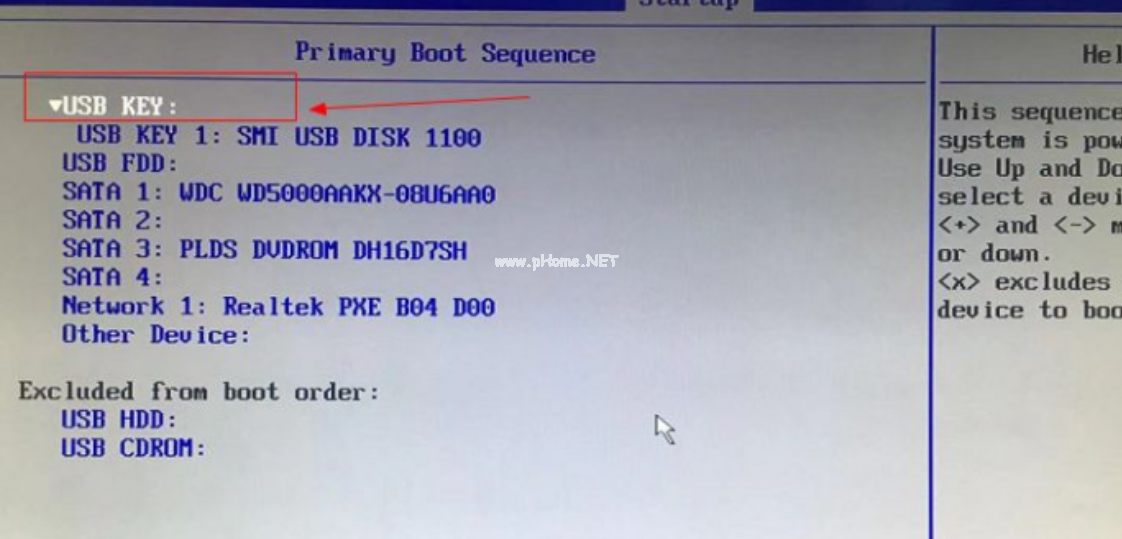 不斷按F12插入U盤選擇usb key回車進(jìn)入U盤啟動模式。進(jìn)入到BIOS界面后,選擇startup選項。將usb key 設(shè)置為第一個。