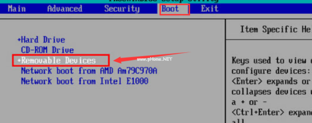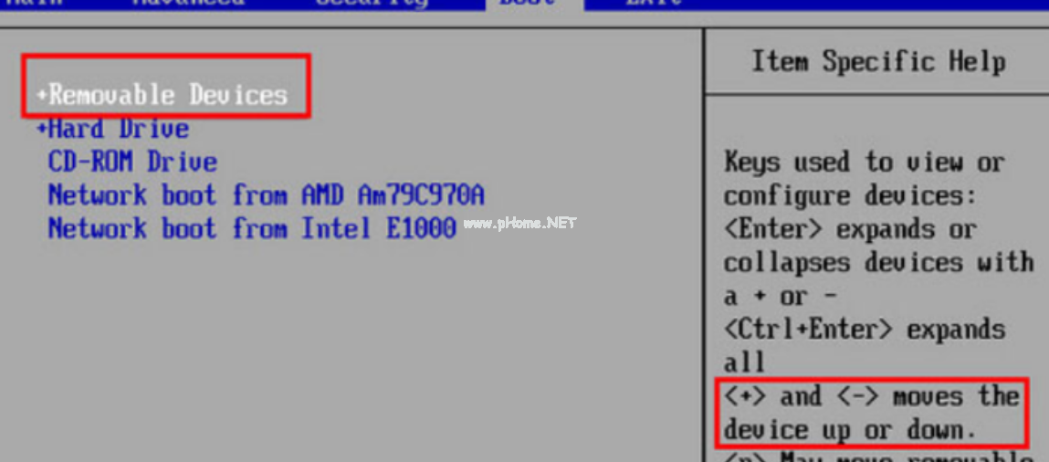 把光標(biāo)移動到“boot”,找到u盤的選項將“removeble device”移動至最上面,。