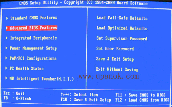 例二、舊的Award BIOS(2009年電腦主板):下圖5:開機(jī)按Del鍵進(jìn)入該BIOS設(shè)置界面,選擇高級BIOS設(shè)置:Advanced BIOS Features