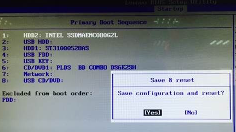 7、調(diào)整到第一位置后,按F10鍵保存設(shè)置后退出,此時(shí)會(huì)彈出一個(gè)窗口,選擇YES。