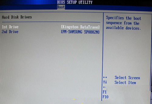 下圖3 :硬盤驅(qū)動器“Hard Disk Drives”選擇:選擇U盤為第一啟動設(shè)備“1st Drive”;