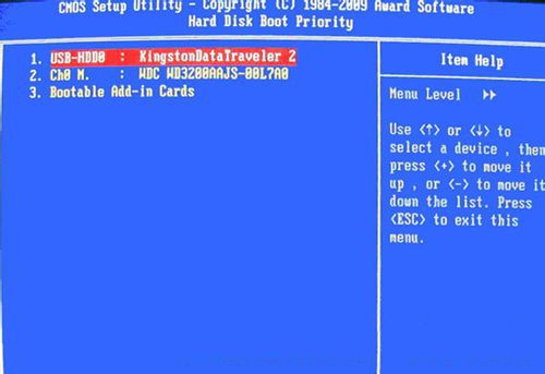 下圖3:硬盤啟動優(yōu)先級(Hard Disk Boot Priority)選擇:使用小鍵盤上的加減號“+、-”來選擇與移動設(shè)備,將U盤選擇在最上面。然后,按ESC鍵退出,回到圖2的設(shè)置界面。