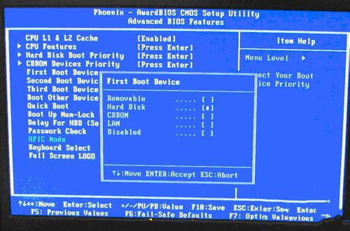 下圖4:再選擇第一啟動設(shè)備(First Boot Device):該版本的BIOS這里沒有U盤的“USB-HDD”、“USB-ZIP”之類的選項(xiàng),經(jīng)嘗試選擇移動設(shè)備“Removable”不能啟動,但選擇“Hard Disk”可以啟動電腦。