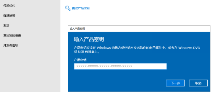 2、點擊更改產(chǎn)品密鑰,輸入密鑰,點擊下一步等待激活。