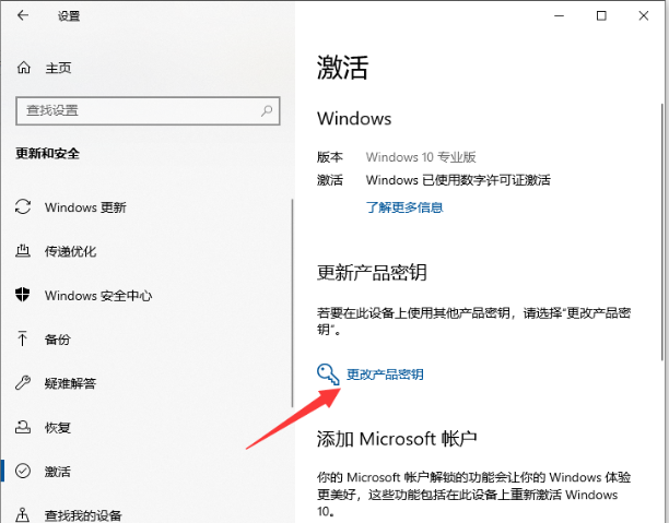 3、選擇更改產(chǎn)品密鑰,輸入win10專業(yè)版密鑰,點下一步,激活完成。