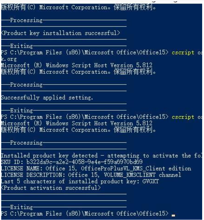 5、之后分別執(zhí)行下面的命令,分別是設置kms服務器,激活Office2013,查看office2013激活狀態(tài);