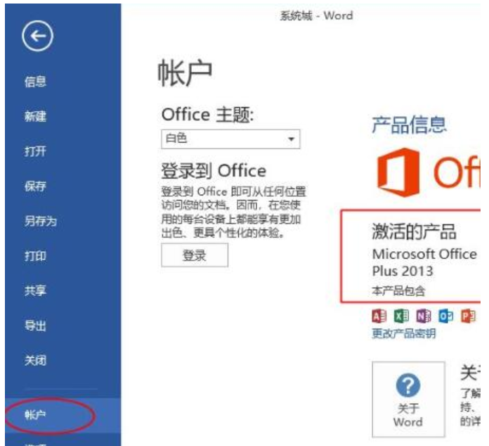 4、最后打開任意的Office2013,比如word,點擊文件—帳戶,顯示激活的產(chǎn)品,表示激活成功。