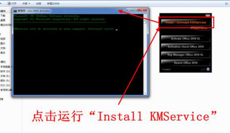 4、點(diǎn)擊激活工具里的“Install/Uninstall KMService”,此時(shí)會(huì)一個(gè)黑色背景的窗口。