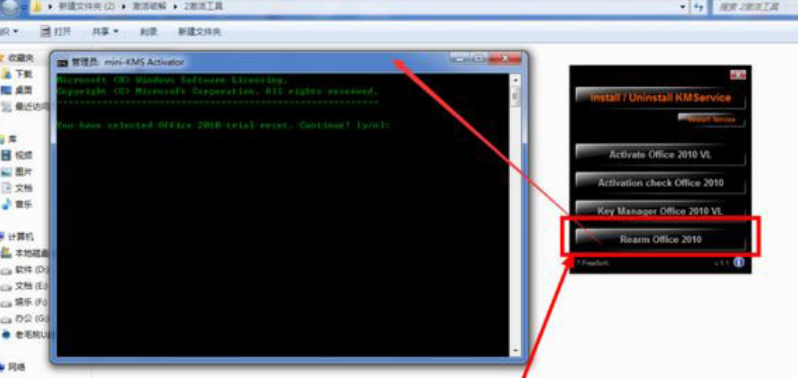 6、接下來(lái)點(diǎn)擊激活工具的最后一項(xiàng)“Rearm Office 2010”,同樣地彈出一個(gè)運(yùn)行窗口