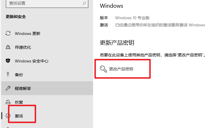 3、點(diǎn)擊“更新和安全”,進(jìn)入界面后點(diǎn)擊右側(cè)的“激活”,找到并點(diǎn)擊“更改產(chǎn)品密鑰”,輸入對(duì)應(yīng)系統(tǒng)版本的激活碼即可。