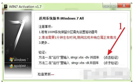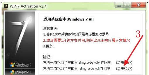 1、重新啟動系統(tǒng)完成后,再次打開“Win7 activation V1.7”,點擊下圖紅色箭頭所指的地方;