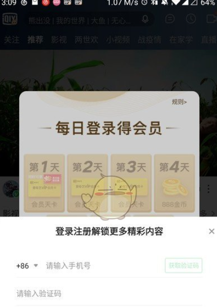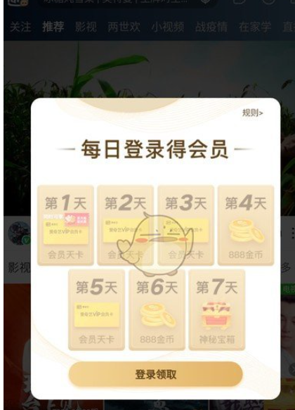 3、下載打開愛奇藝隨刻版APP,彈出一個“每日登錄得會員”的活動彈窗,點擊“登陸領(lǐng)取”