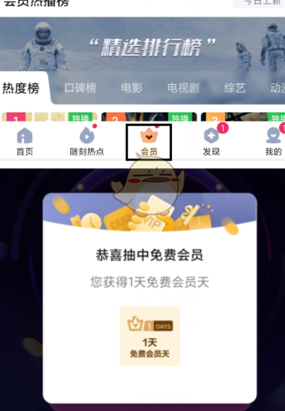 2、打開愛奇藝app>點底部菜單欄會員>下拉找到搖一搖抽獎,3次機(jī)會用完,親測中了1天會員。