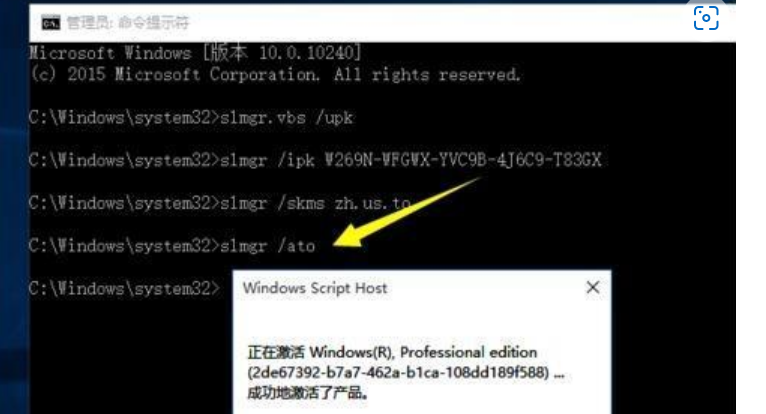 5.當(dāng)再輸入以下命令時(shí):slmgr /ato 按回車鍵后將彈出“成功的激活了產(chǎn)品”的提示窗口;