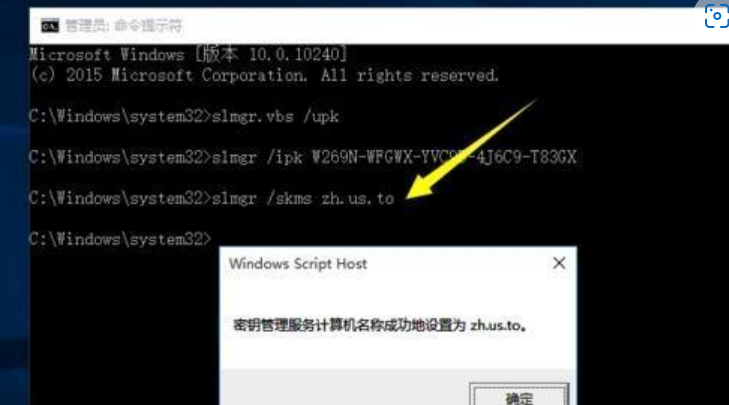 4.然后繼續(xù)輸入以下命令: slmgr /skms zh.us.to 按回車后將彈出“密鑰管理服務(wù)計(jì)算機(jī)名成功的設(shè)置為zh.us.to”的提示;