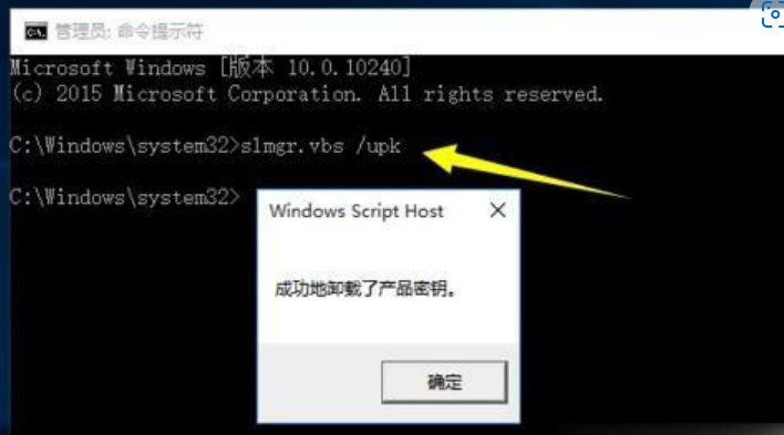 2.從打開的“命令提示符”窗口中,輸入命令:slmgr.vbs /upk ,按回車鍵即可彈出如圖所示的“已成功卸載了產(chǎn)品密鑰”的提示。注意:也可以通過先復(fù)制以上命令,然后在MSDOW窗口中右擊鼠標(biāo)即可完成命令的粘貼操作;
