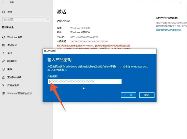 3、在彈出的框中輸入你的Windows的產(chǎn)品密鑰,點(diǎn)擊下一步即可。