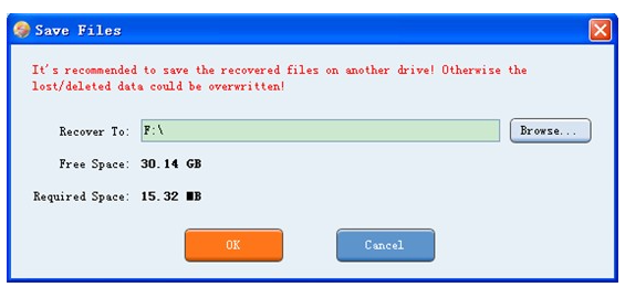 5、最后請點擊“瀏覽... ”按鈕選擇保存恢復(fù)數(shù)據(jù)的安全位置(注意:不要將恢復(fù)的數(shù)據(jù)直接保存到U盤,否則會出現(xiàn)數(shù)據(jù)恢復(fù)失敗),并單擊“確定”按鈕。執(zhí)行上述所有操作后,即可成功恢復(fù)U盤丟失的數(shù)據(jù)。