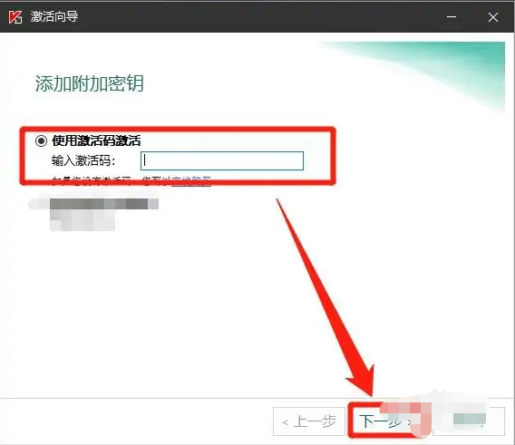 3、選擇【使用激活碼激活】,在下面輸入激活碼,點(diǎn)擊下一步激活即可。