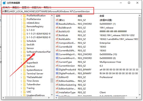 2、接著在注冊表中定位到HKEY_LOCAL_MACHINE/SOFTWARE/Microsoft/WindowsNT/CurrentVersion/SoftwareProtectionPlatform注冊表項(xiàng)。
