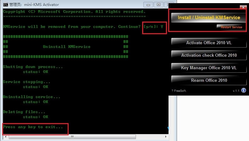4、點(diǎn)擊“Install/Uninstall KMService”安裝“KMS”服務(wù)器。如下圖所示,在彈出的窗口輸入Y,安裝KMS服務(wù)器。安裝過程與結(jié)果如下圖所示,看到“Press any key to exit”,即表示安裝成功,這個(gè)時(shí)候隨便按一個(gè)鍵盤,退出窗口。