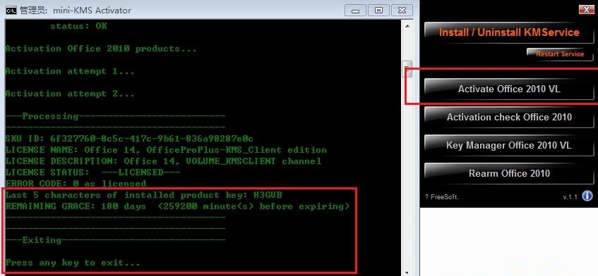 6、最后,點(diǎn)擊“Activate Office 2010 VL”,即可成功激活,什么都不需要輸入,如下圖所示。會顯示180天的限制,不用擔(dān)心,到180天再次運(yùn)行這個(gè)正版激活工具,又是180天。