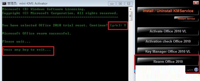 5、再點(diǎn)擊“Rearm Office 2010”進(jìn)行重置,同樣也會彈出一個(gè)窗口,在彈出窗口中輸入Y,進(jìn)行重置。稍微等一會即可看到看到“Press any key to exit”,確定,進(jìn)入下一步。