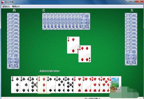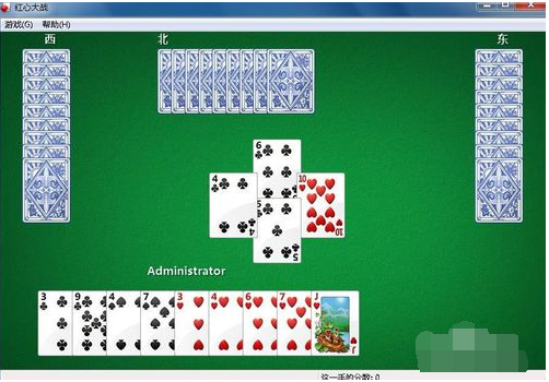4. 本輪有一張紅心牌。右邊的玩家選擇紅心牌,因?yàn)闆](méi)有不花色的牌。其他三家具樂(lè)部中最大的球員將獲得1分,即擁有六家具樂(lè)部的球員。