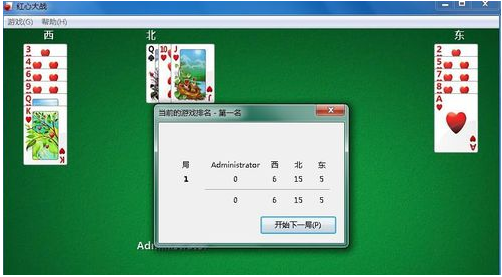 6. 每輪打完所有牌后,會(huì)彈出一個(gè)對(duì)話框,顯示每個(gè)玩家的分?jǐn)?shù)。