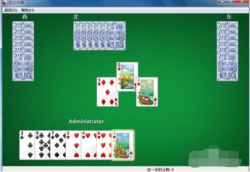 5. 本輪其他三人打菱形牌,我沒(méi)有菱形牌,所以可以打其他花色。這個(gè)時(shí)候就得打心讓其他玩家得分,或者打出數(shù)值更高的牌,避免以后打這些牌的時(shí)候給自己打分。