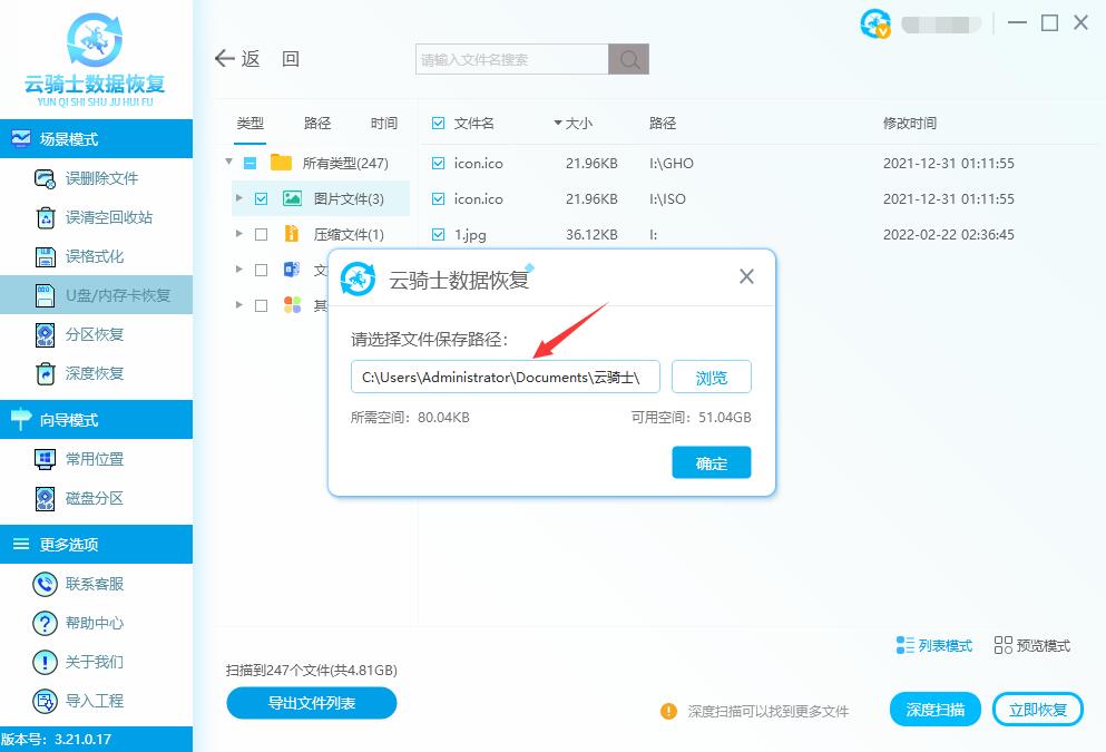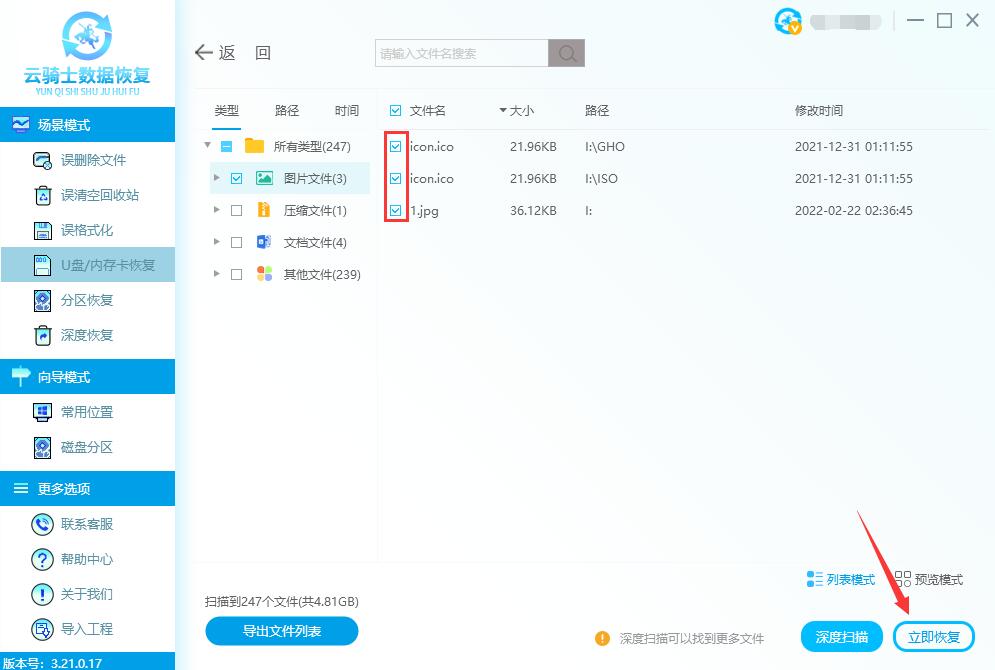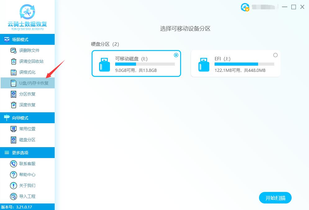 1、以云騎士數(shù)據(jù)恢復軟件為例,將需要恢復的U盤插入電腦,在場景模式中選擇U盤/存儲卡恢復。