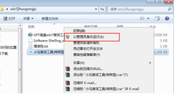 2、打開壓縮后的文件,點擊小馬激活工具,點擊“以管理員身份運行”進行操作。