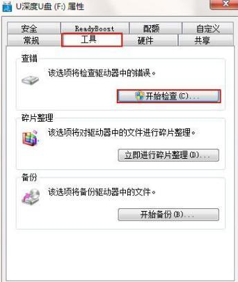 2、在彈出的屬性窗口界面中,點擊工具選項卡,點擊開始檢查。