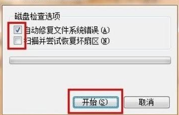 3、最后將“自動修復(fù)文件系統(tǒng)錯誤”和“掃描并嘗試恢復(fù)壞扇區(qū)”都勾選,點擊“開始”進行掃描,掃描完成即可修復(fù)。
