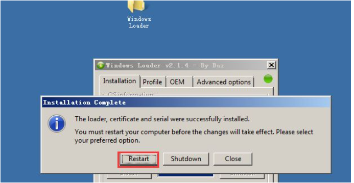 5、運行完成之后,會提示我們需要重啟系統(tǒng),鼠標(biāo)點擊restart重啟系統(tǒng),如果不重啟電腦的話會激活失敗的。
