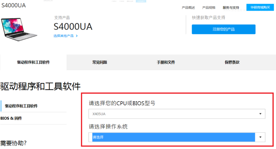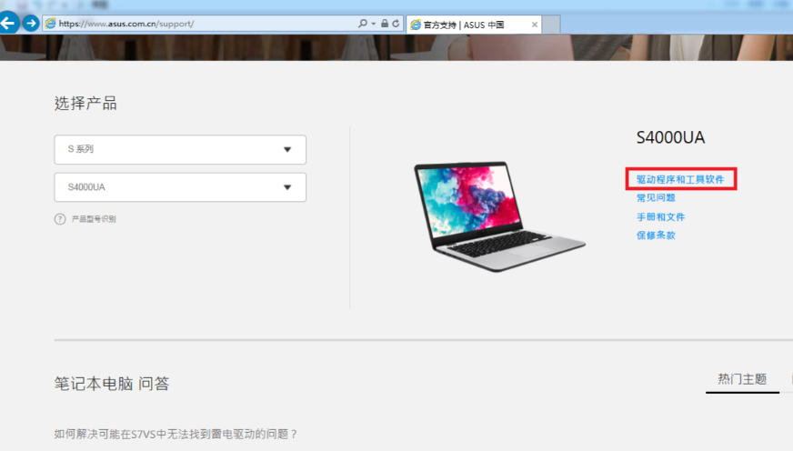 1、在www.asus.com.cn/support頁(yè)面下方,直接選擇產(chǎn)品類型和具體的型號(hào),點(diǎn)擊右側(cè)的驅(qū)動(dòng)程序和工具軟件進(jìn)入。