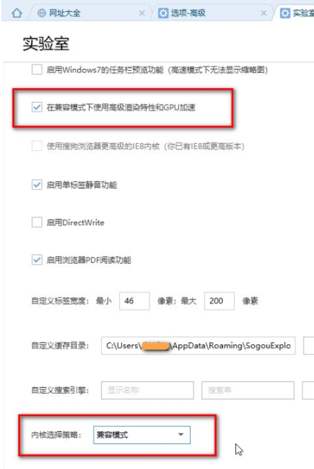 4.勾選“在兼容模式下使用高級渲染特性和GPU加速”,把內(nèi)核選擇策略更改為“兼容模式”即可成功設(shè)置搜狗瀏覽器兼容模式。