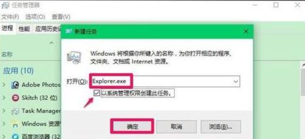 2、點(diǎn)擊“文件”選項(xiàng)卡,鼠標(biāo)點(diǎn)擊“運(yùn)行新任務(wù)”,輸入“Explorer.exe”,勾選“以系統(tǒng)管理權(quán)限創(chuàng)建此任務(wù)”,點(diǎn)擊確定,這時(shí)系統(tǒng)桌面圖標(biāo)即可恢復(fù)正常;
